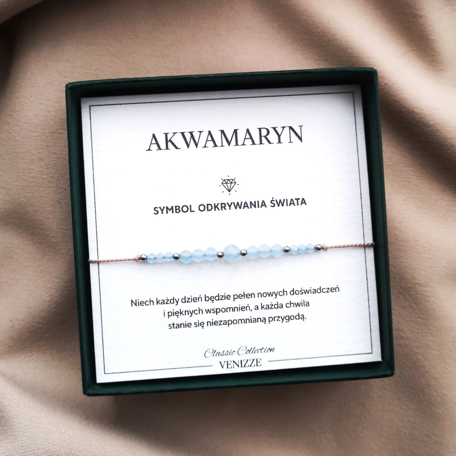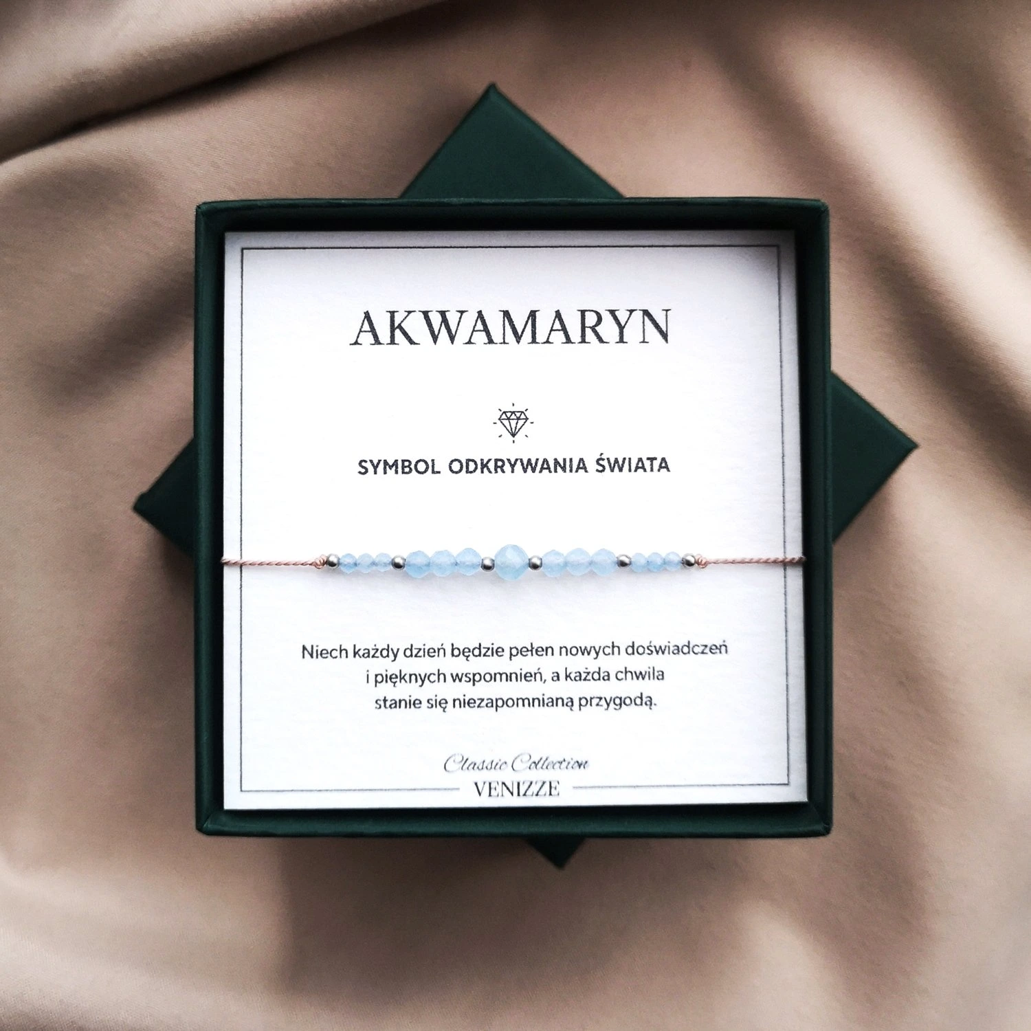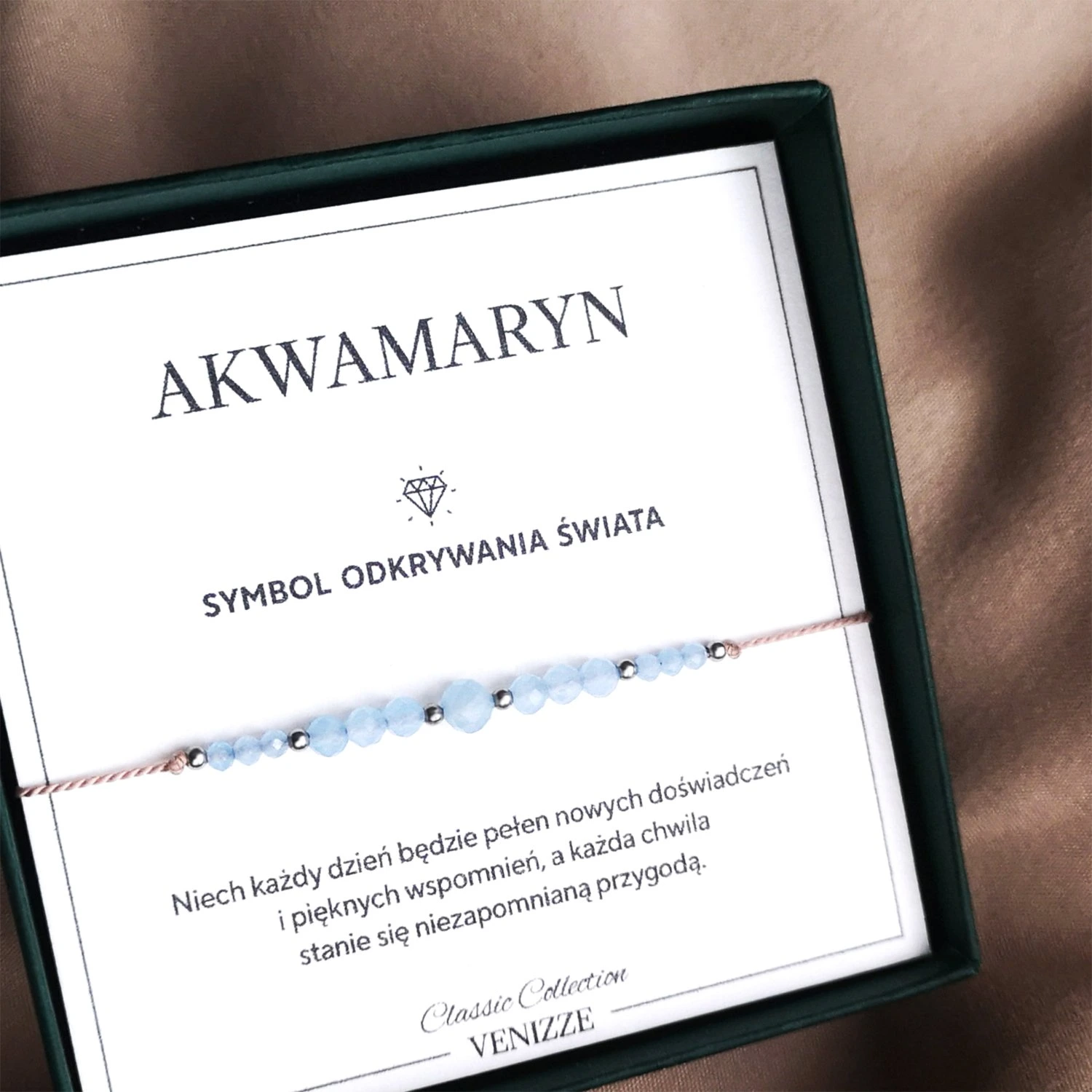 Bransoletka z akwamarynem to wyjątkowa biżuteria, która nie tylko zachwyca swoim subtelnym, niebiesko-zielonym odcieniem, ale także dodaje uroku i elegancji. Akwamaryn, znany jako kamień odwagi i ambicji, jest idealnym talizmanem dla osób dążących do realizacji swoich marzeń i celów. Według wierzeń, noszenie bransoletki z akwamarynem dodaje pewności siebie, inspiruje do podejmowania nowych wyzwań oraz wspiera w dążeniu do sukcesu. Bransoletka z akwamarynem to nie tylko elegancki dodatek, ale także potężny amulet, chroni w podróży oraz przynosi spokój i opanowanie. Idealna na prezent dla bliskiej osoby lub jako osobisty talizman.