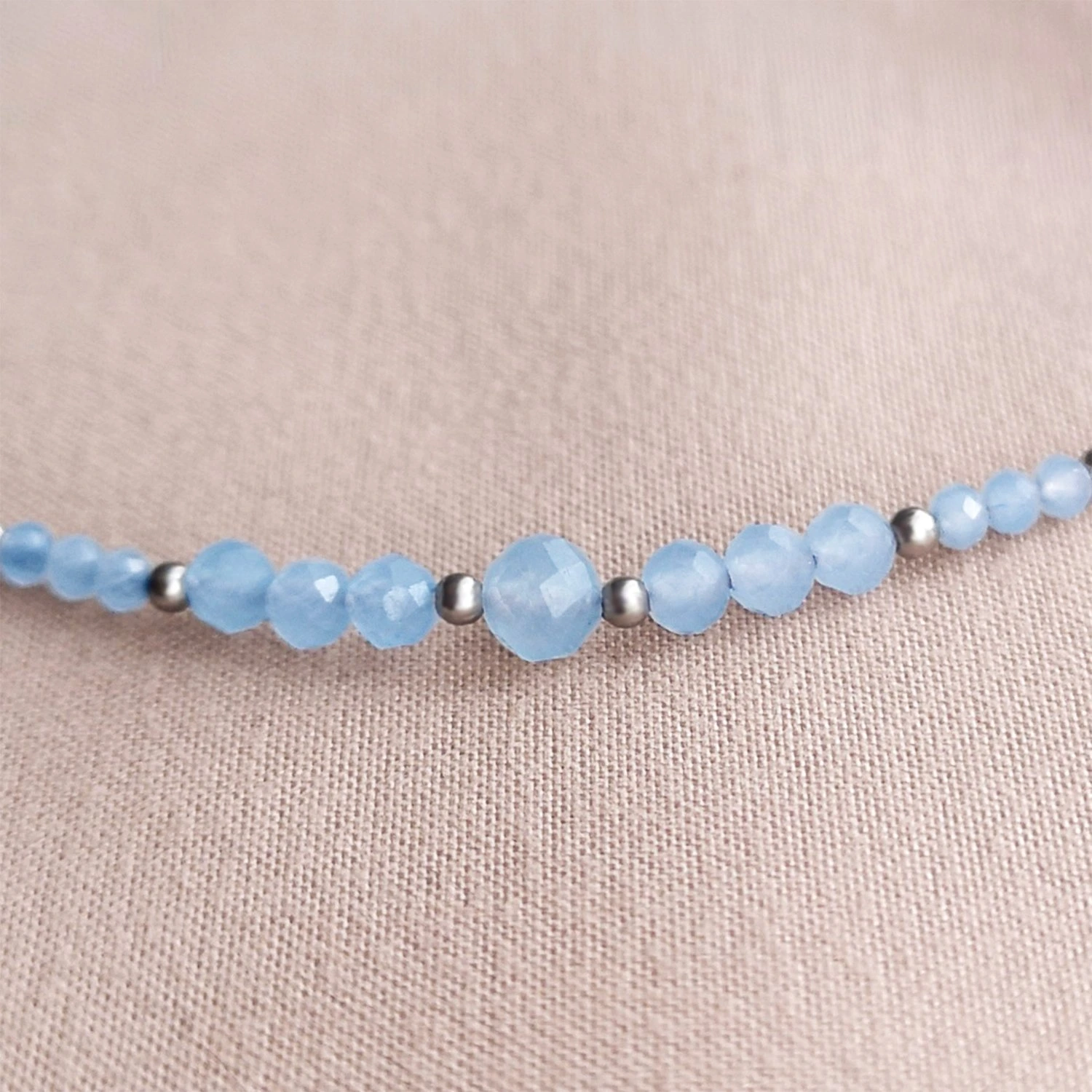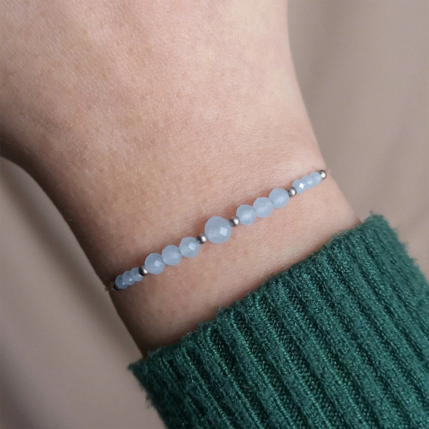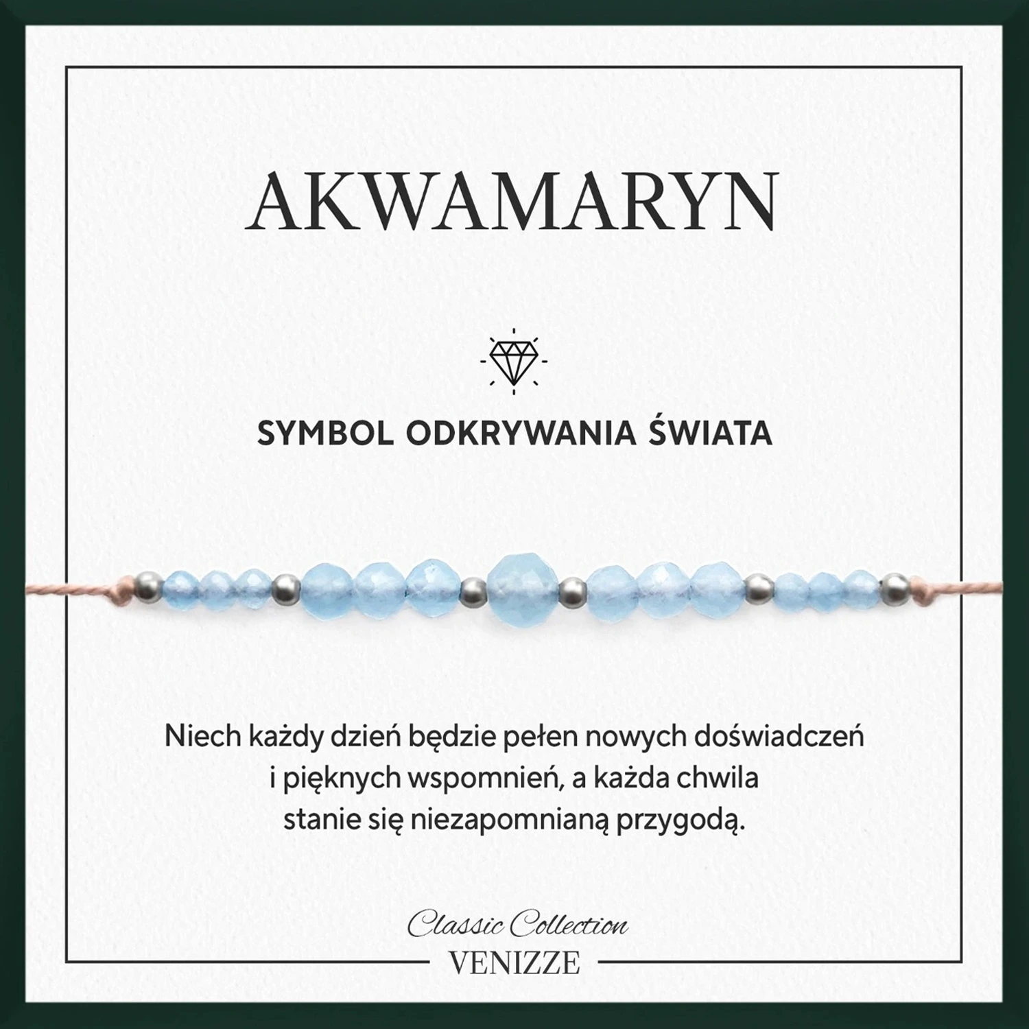 Bransoletka z akwamarynem to wyjątkowa biżuteria, która nie tylko zachwyca swoim subtelnym, niebiesko-zielonym odcieniem, ale także dodaje uroku i elegancji. Akwamaryn, znany jako kamień odwagi i ambicji, jest idealnym talizmanem dla osób dążących do realizacji swoich marzeń i celów. Według wierzeń, noszenie bransoletki z akwamarynem dodaje pewności siebie, inspiruje do podejmowania nowych wyzwań oraz wspiera w dążeniu do sukcesu. Bransoletka z akwamarynem to nie tylko elegancki dodatek, ale także potężny amulet, chroni w podróży oraz przynosi spokój i opanowanie. Idealna na prezent dla bliskiej osoby lub jako osobisty talizman.