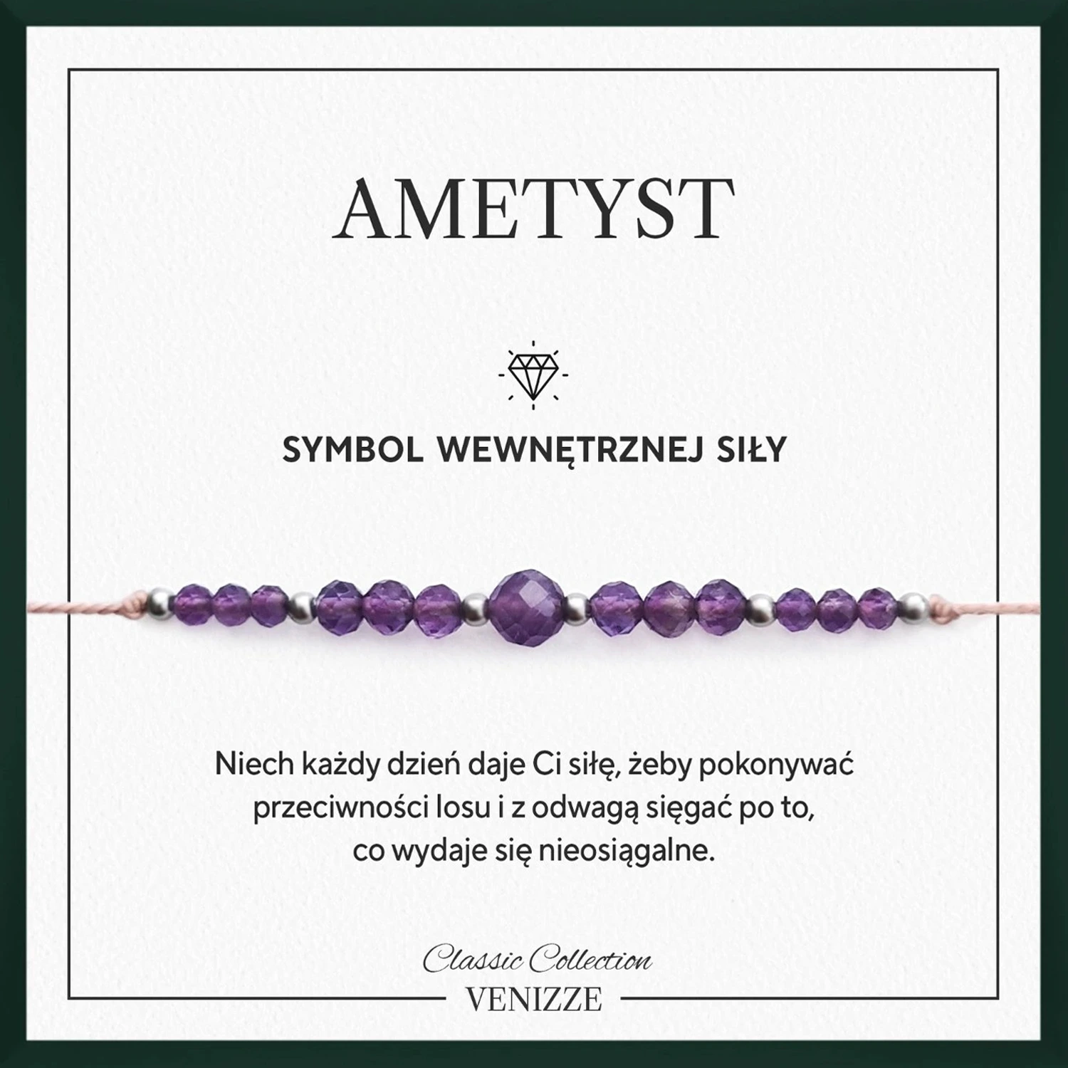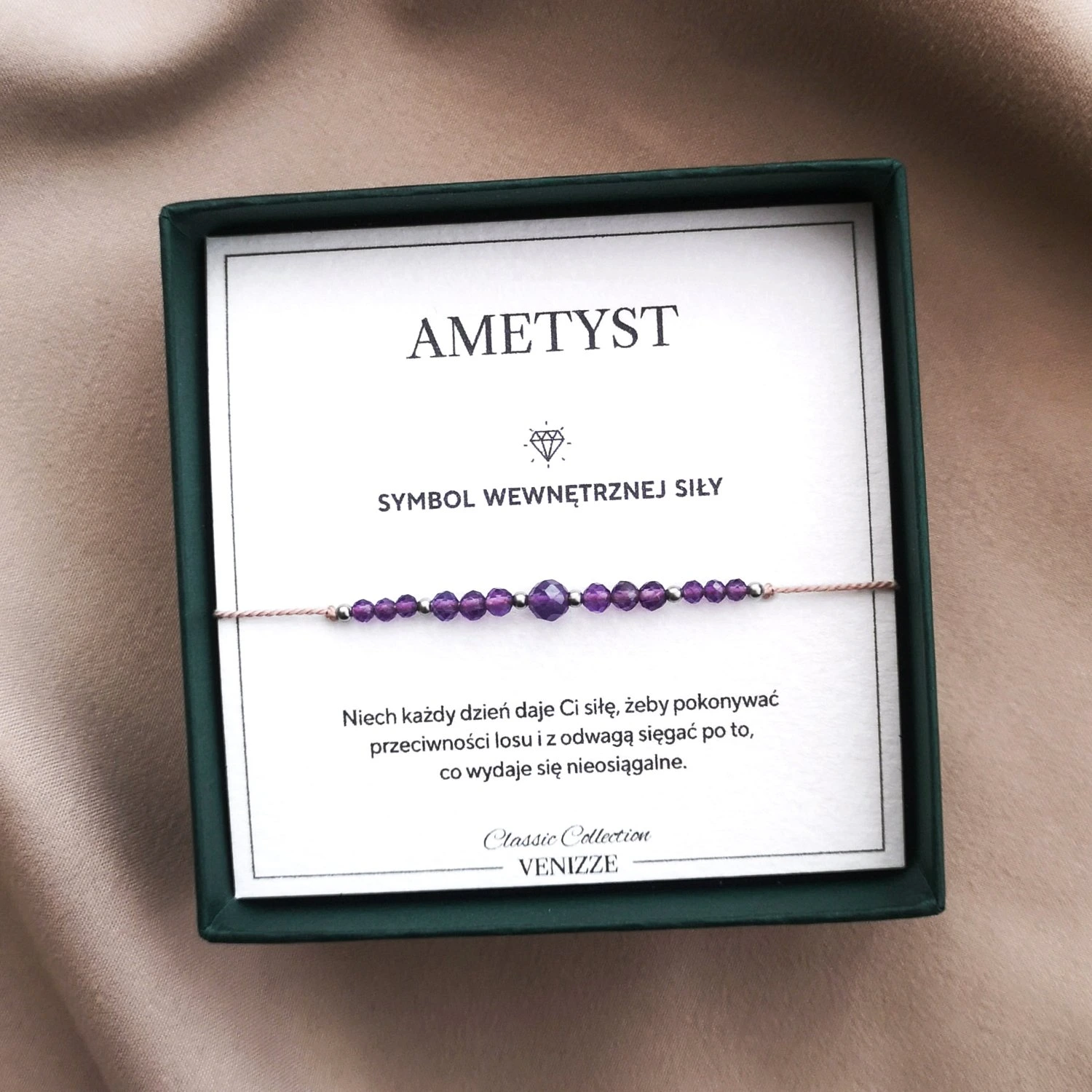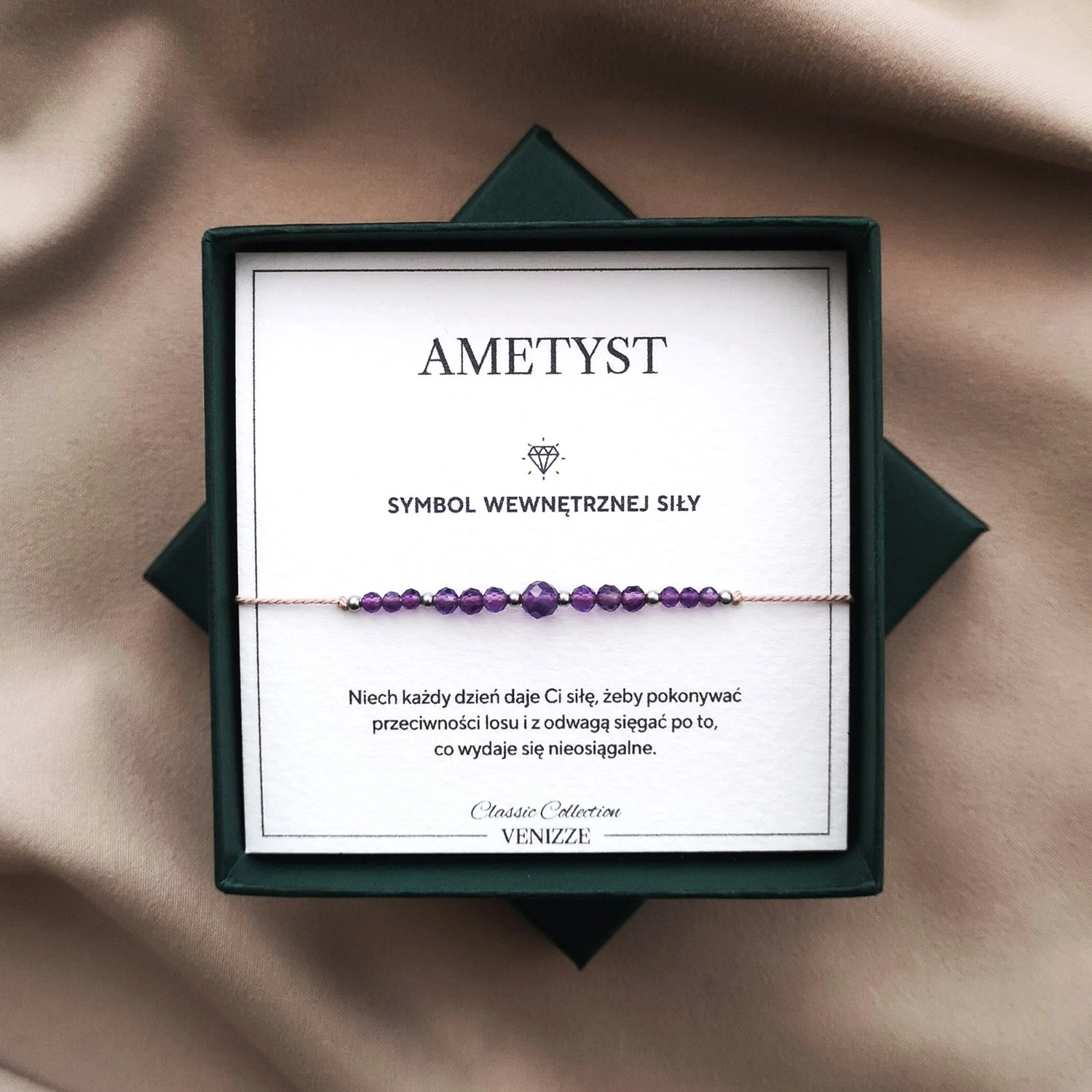 Bransoletka wykonana z kamieni ametystu, to wyjątkowy dodatek, który łączy w sobie elegancję, bogactwo oraz naturalność. Ametyst – kamień szlachetny, o swoim charakterystycznym fioletowym odcieniu, jest od wieków ceniony za swoje potężne właściwości energetyczne i ochronne. Bransoletka z ametystem to nie tylko piękna biżuteria, ale także potężny amulet o wszechstronnych właściwościach. Idealna na prezent dla bliskiej osoby lub jako osobisty talizman, który wspiera elegancję, bogactwo, równowagę oraz walkę z uzależnieniami.