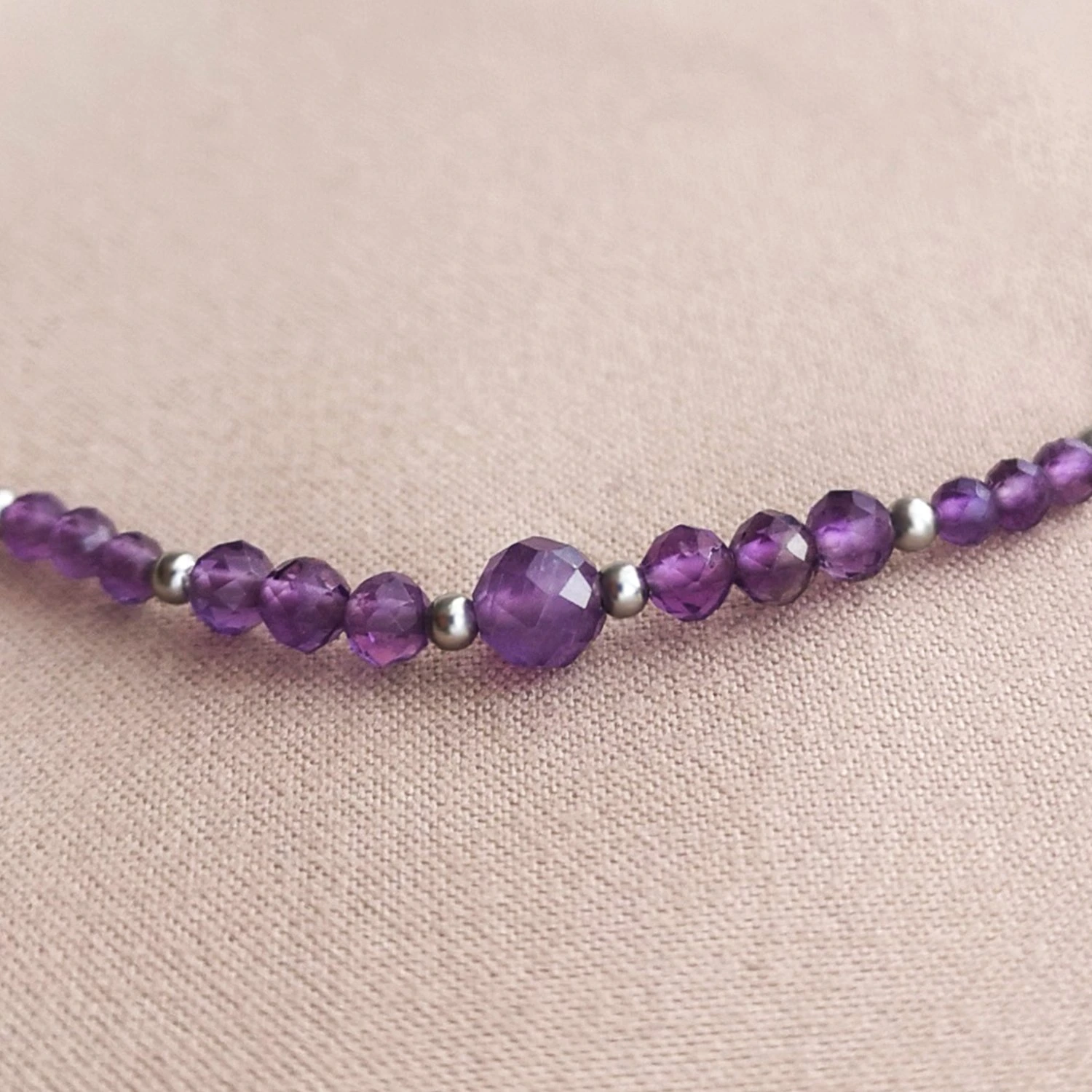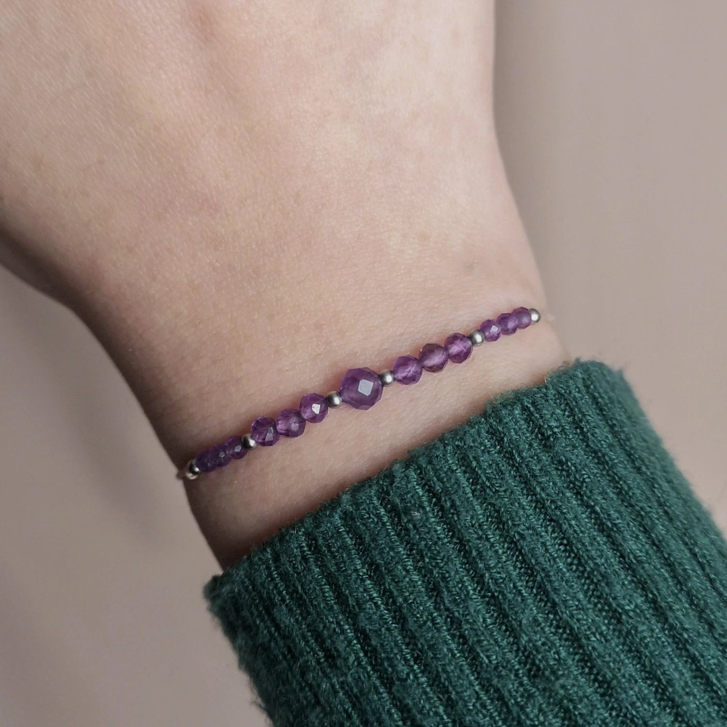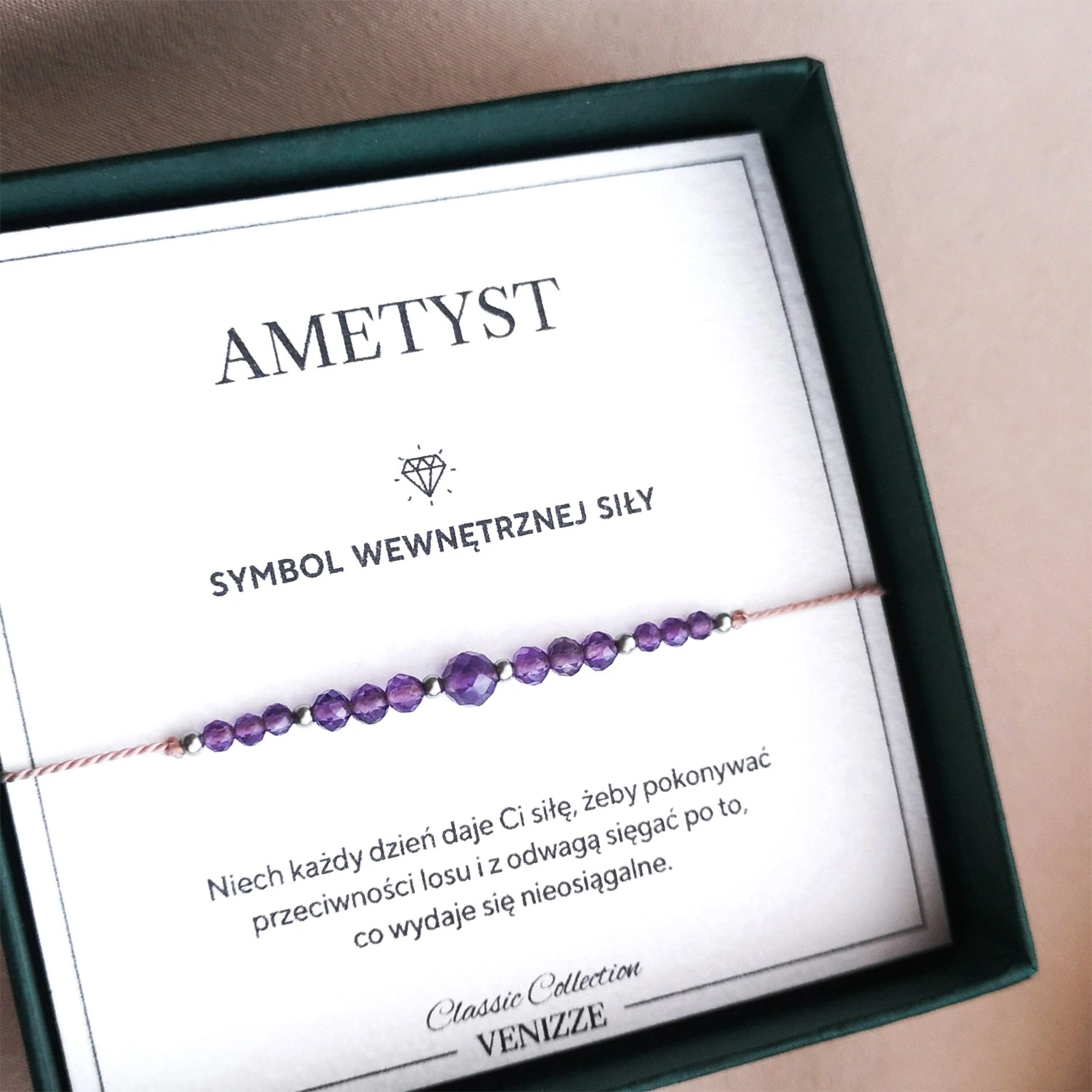 Bransoletka wykonana z kamieni ametystu, to wyjątkowy dodatek, który łączy w sobie elegancję, bogactwo oraz naturalność. Ametyst – kamień szlachetny, o swoim charakterystycznym fioletowym odcieniu, jest od wieków ceniony za swoje potężne właściwości energetyczne i ochronne. Bransoletka z ametystem to nie tylko piękna biżuteria, ale także potężny amulet o wszechstronnych właściwościach. Idealna na prezent dla bliskiej osoby lub jako osobisty talizman, który wspiera elegancję, bogactwo, równowagę oraz walkę z uzależnieniami.