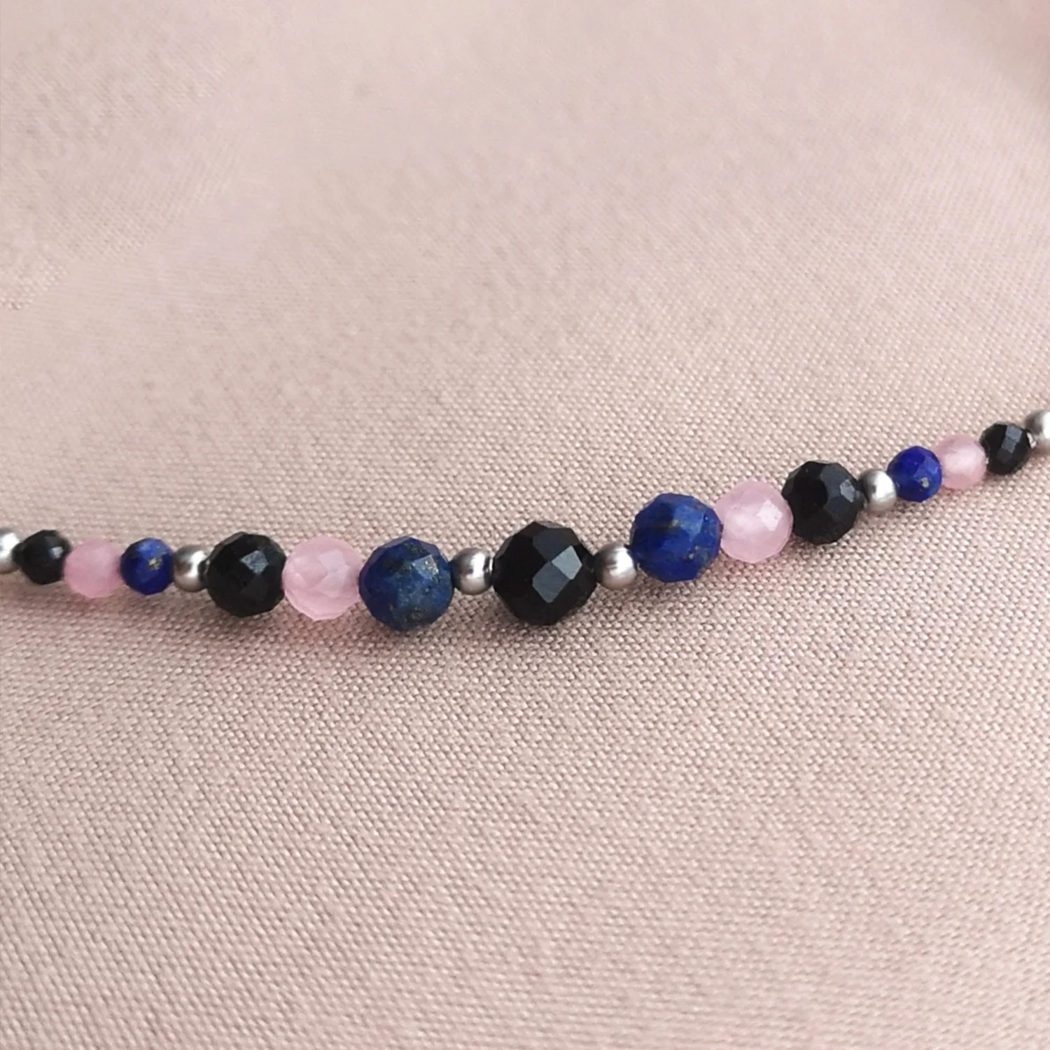 Bransoletka z naturalnych kamieni szlachetnych oraz półszlachetnych na jedwabnym sznurku została zaprojektowana z myślą o uniwersalnym rozmiarze, dzięki czemu pasuje na każdą rękę. Nie zsuwa się z dłoni, szybko ją się zakłada oraz ściąga. Posiada praktyczny stoper, który umożliwia łatwe regulowanie długości, co czyni ją wygodną i bezpieczną w noszeniu przez osoby o różnych rozmiarach nadgarstka. Bransoletka regulowana jest do 24 cm. Potrzebujesz innej długości? – Napisz do nas.
