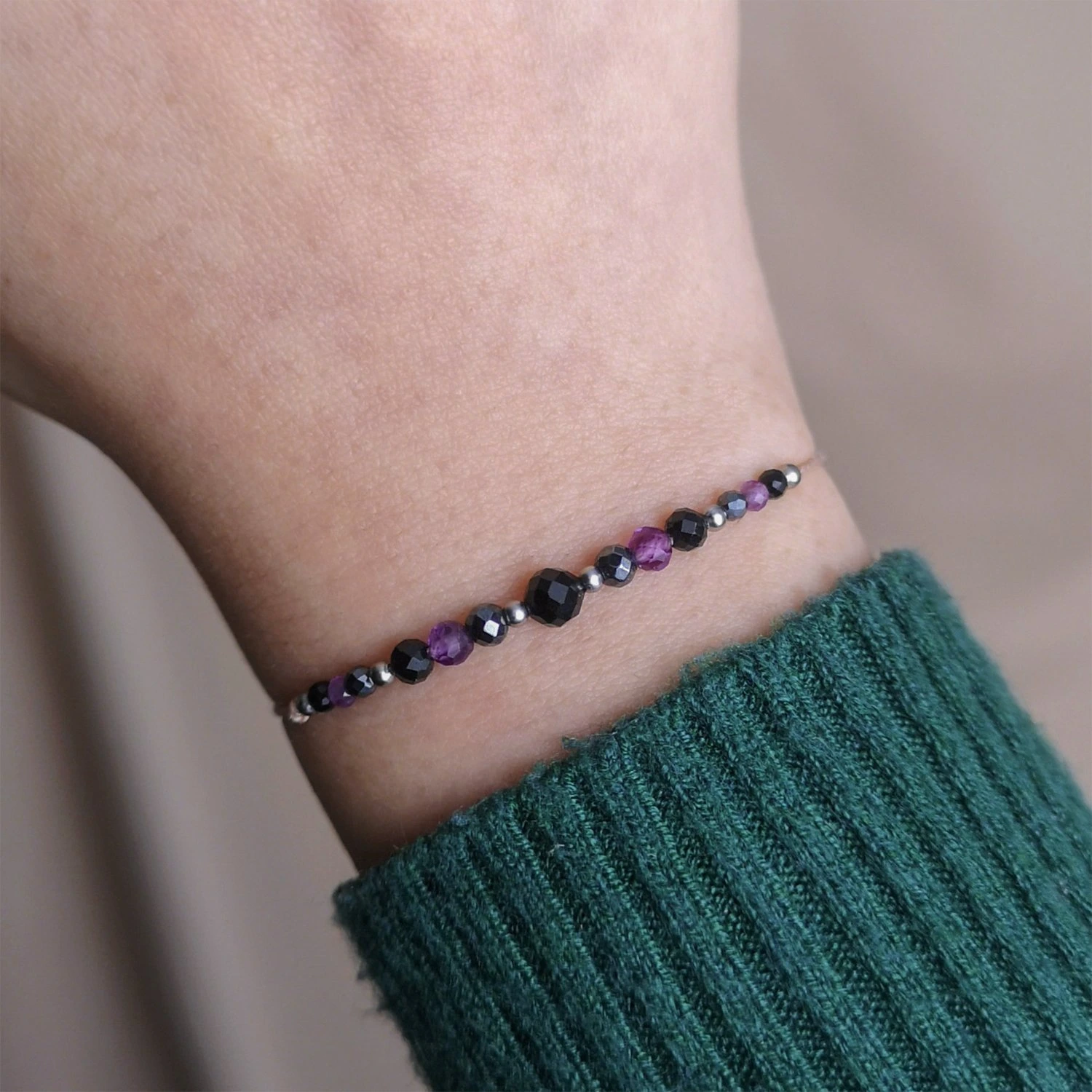 Bransoletka z naturalnych kamieni szlachetnych oraz półszlachetnych na jedwabnym sznurku została zaprojektowana z myślą o uniwersalnym rozmiarze, dzięki czemu pasuje na każdą rękę. Nie zsuwa się z dłoni, szybko ją się zakłada oraz ściąga. Posiada praktyczny stoper, który umożliwia łatwe regulowanie długości, co czyni ją wygodną i bezpieczną w noszeniu przez osoby o różnych rozmiarach nadgarstka. Bransoletka regulowana jest do 24 cm. Potrzebujesz innej długości? – Napisz do nas.