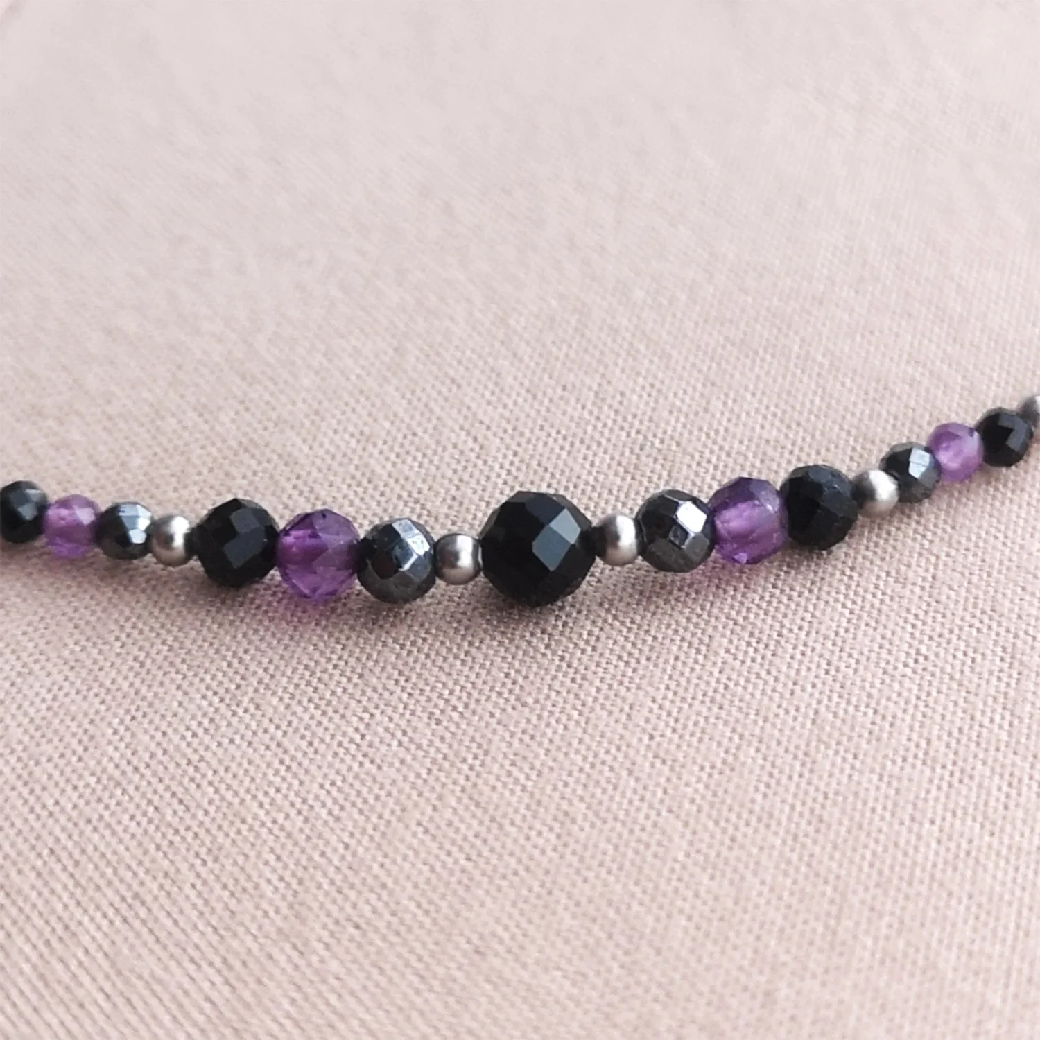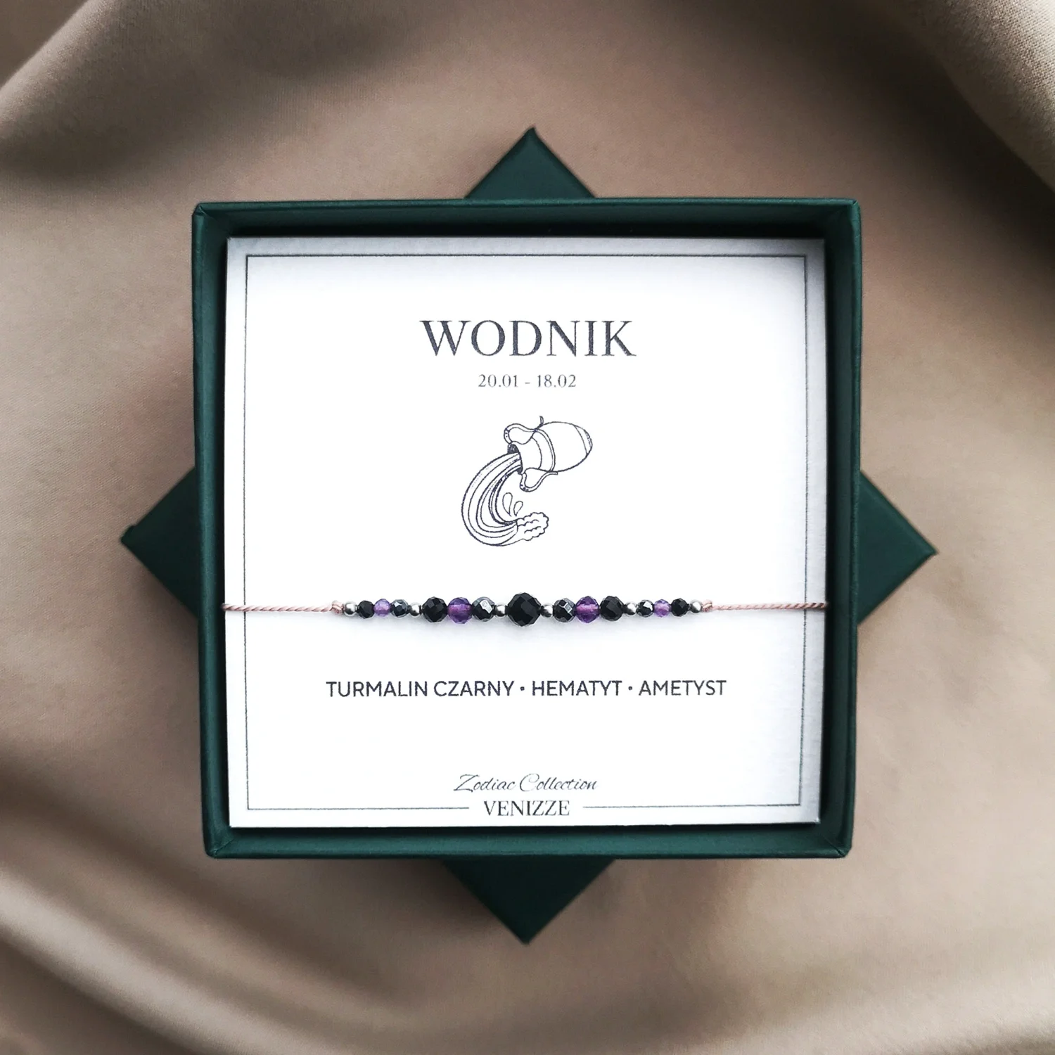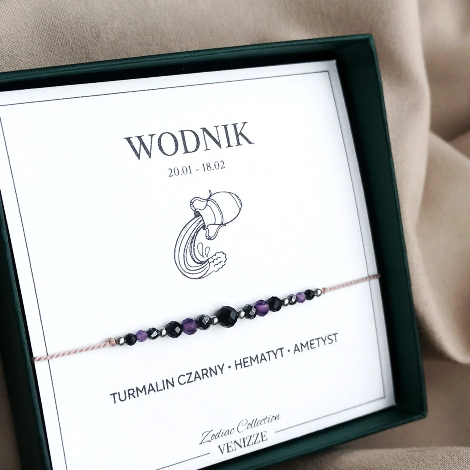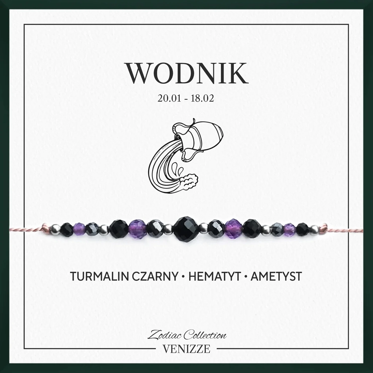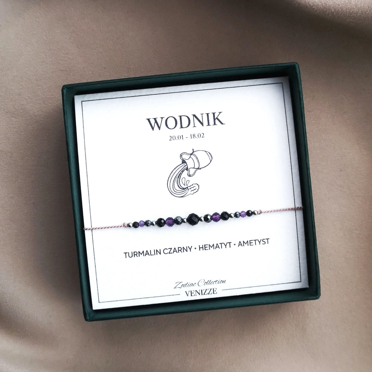 Wodnik to znak powietrza, co sprawia, że jest pełen pomysłów, otwarty na nowe doświadczenia i zafascynowany pomysłami. Idealna bransoletka dla wodnika, wykonana z kamieni szlachetnych takich jak Turmalin Czarny, Hematyt i Ametyst, wspiera jego naturalne cechy, dodając mu siły oraz ochrony. Bransoletka z tymi kamieniami naturalnymi na jedwabnym sznurku nie tylko podkreśla unikalny styl wodnika, ale również pomaga w osiąganiu jego ambitnych celów. Idealna na prezent lub jako osobisty talizman, łączy w sobie piękno i moc naturalnych minerałów, aby wzmocnić pozytywne cechy wodnika.
