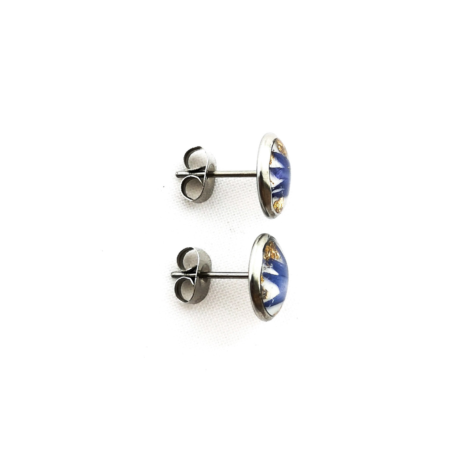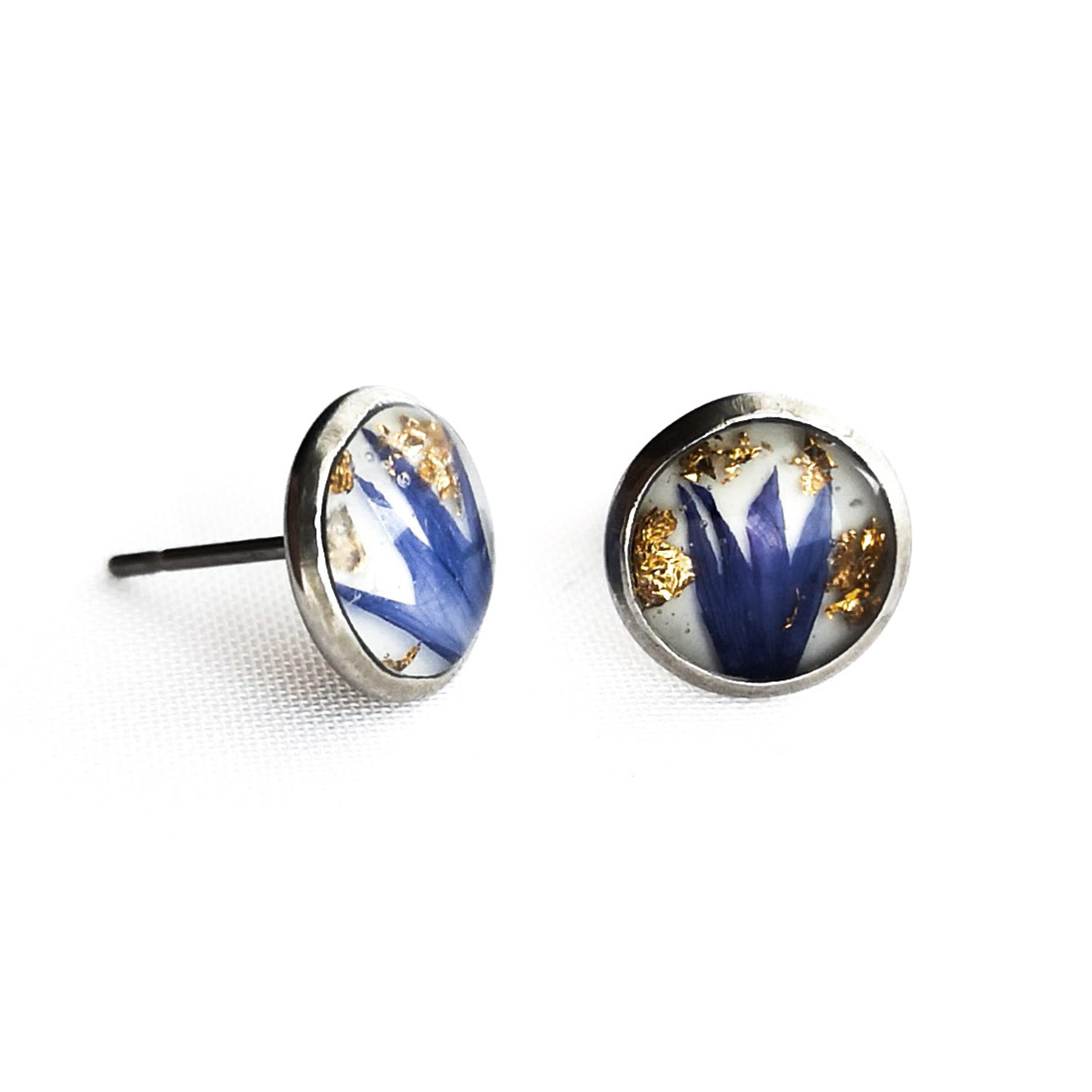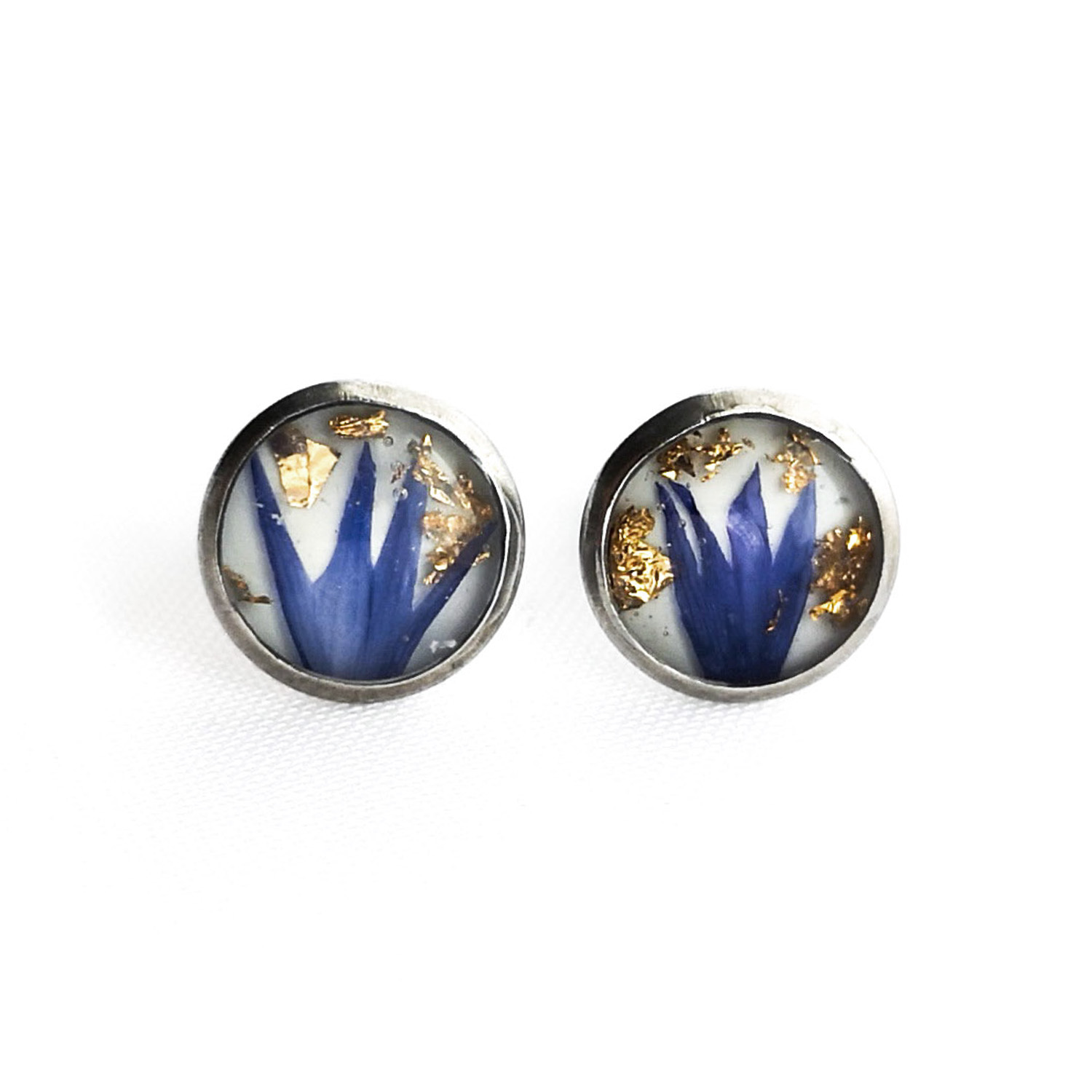 Kolczyki sztyfty ze stali chirurgicznej w kształcie koła, w których na białym tle zatopiono płatki chabra oraz folię w złotym kolorze.