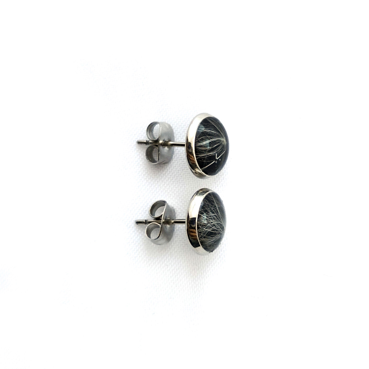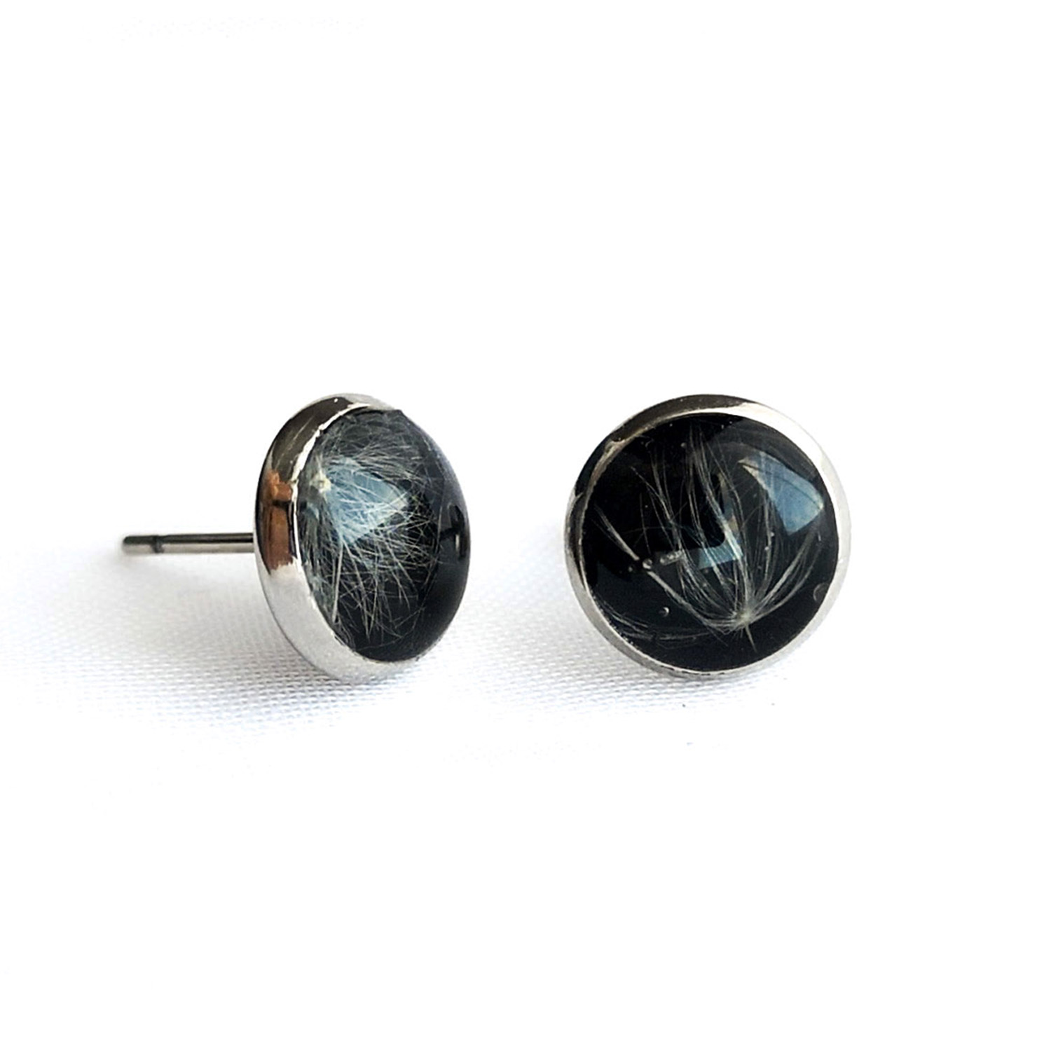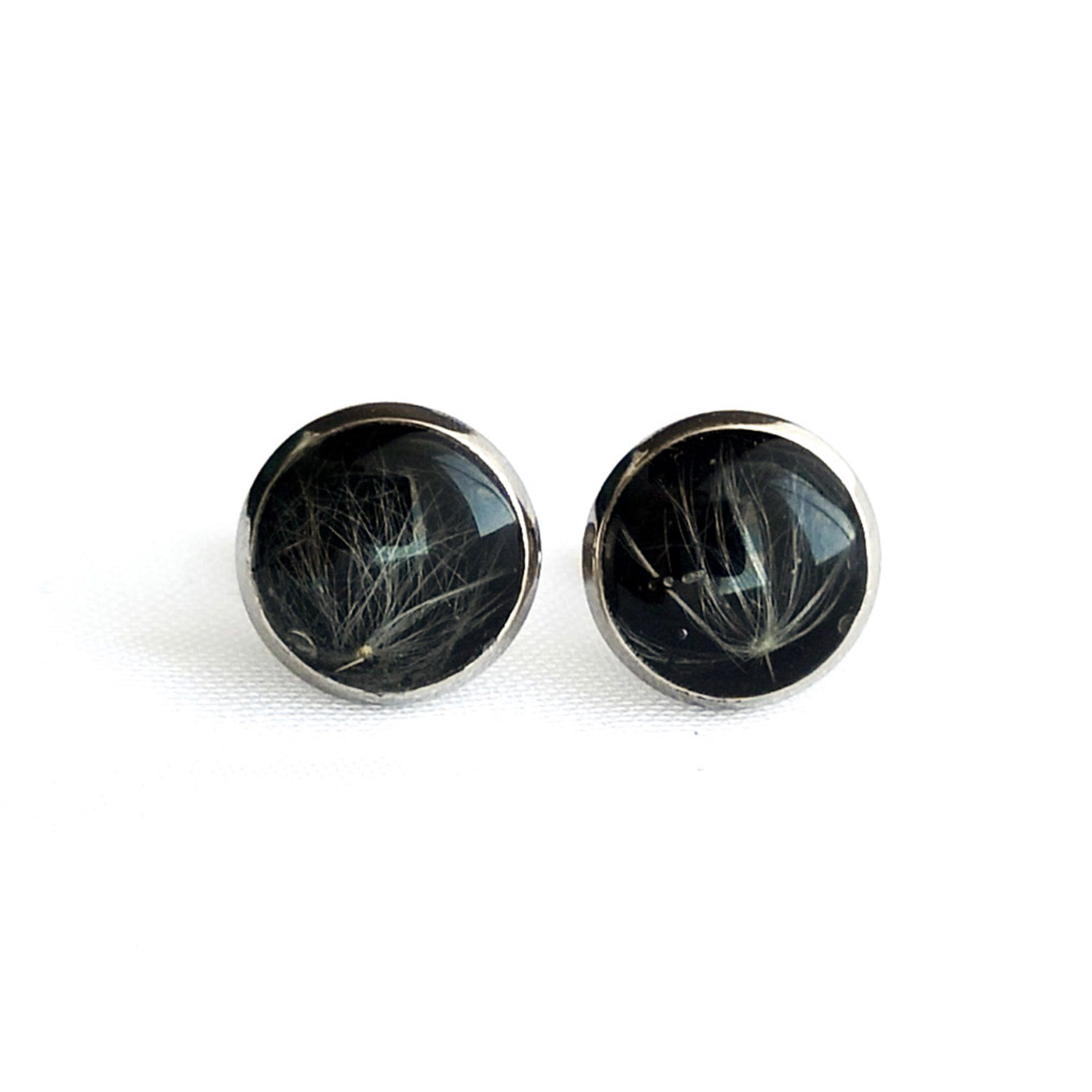 Kolczyki sztyfty ze stali chirurgicznej w kształcie koła, w których zatopiono nasiona dmuchawca na czarnym tle.