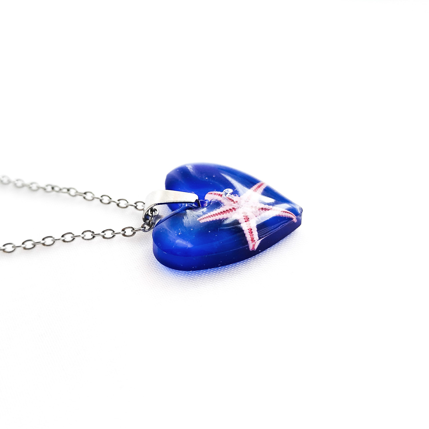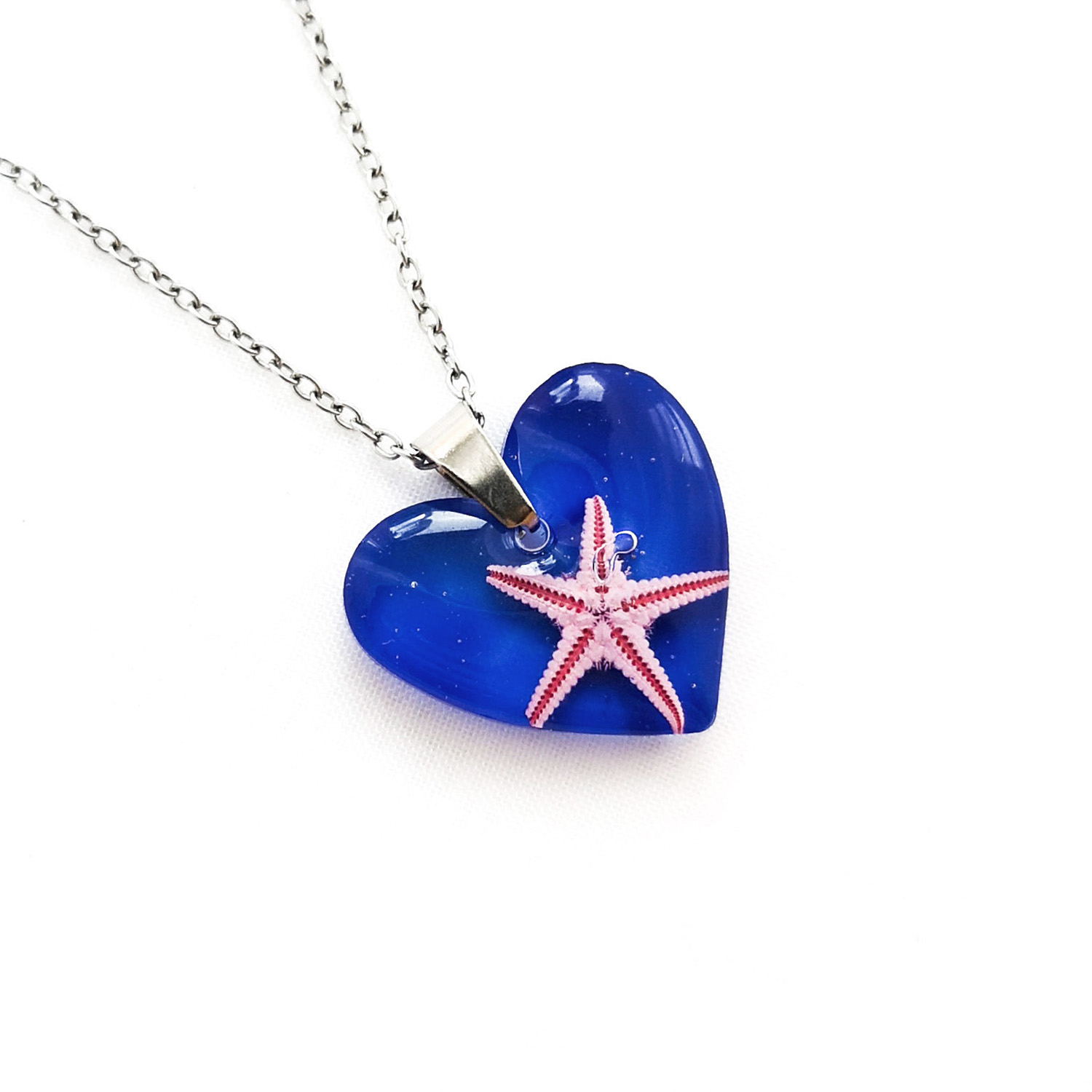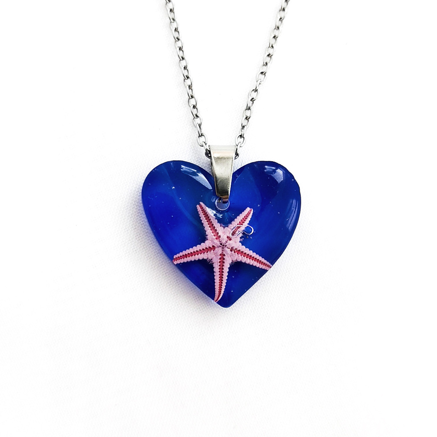 Regulowany naszyjnik ze stali chirurgicznej z zawieszką w kształcie serca, w której zatopiono różową rozgwiazdę.