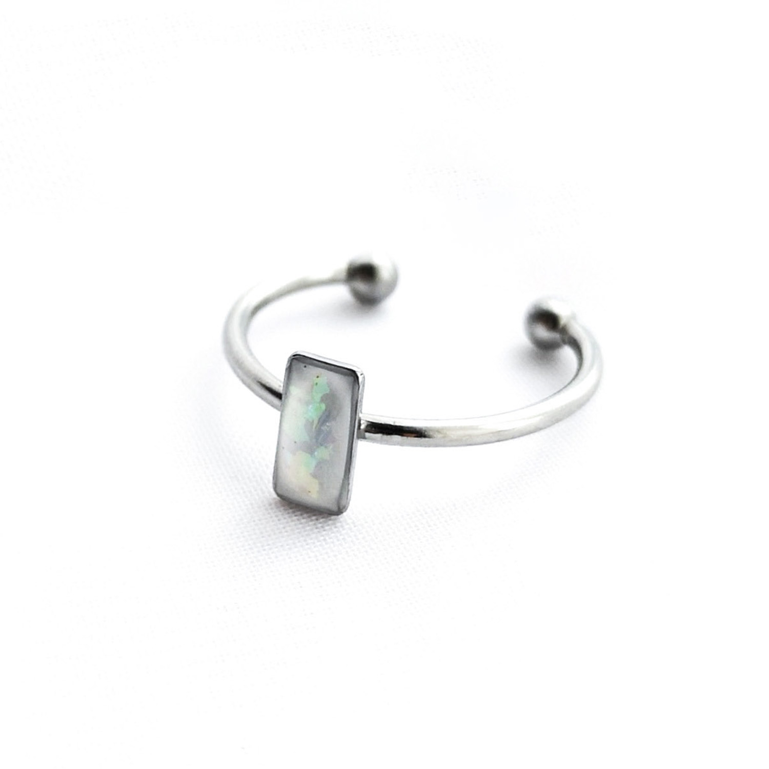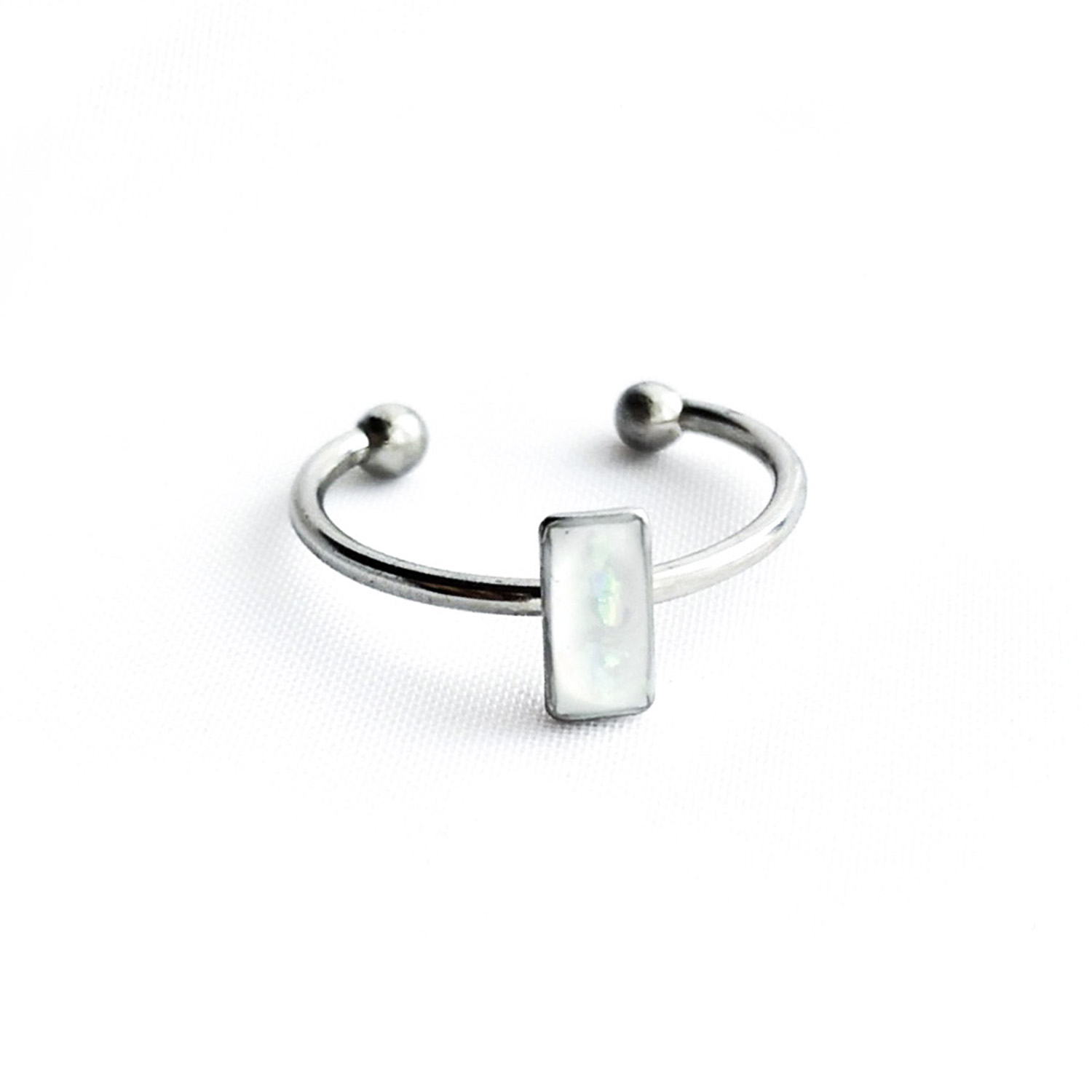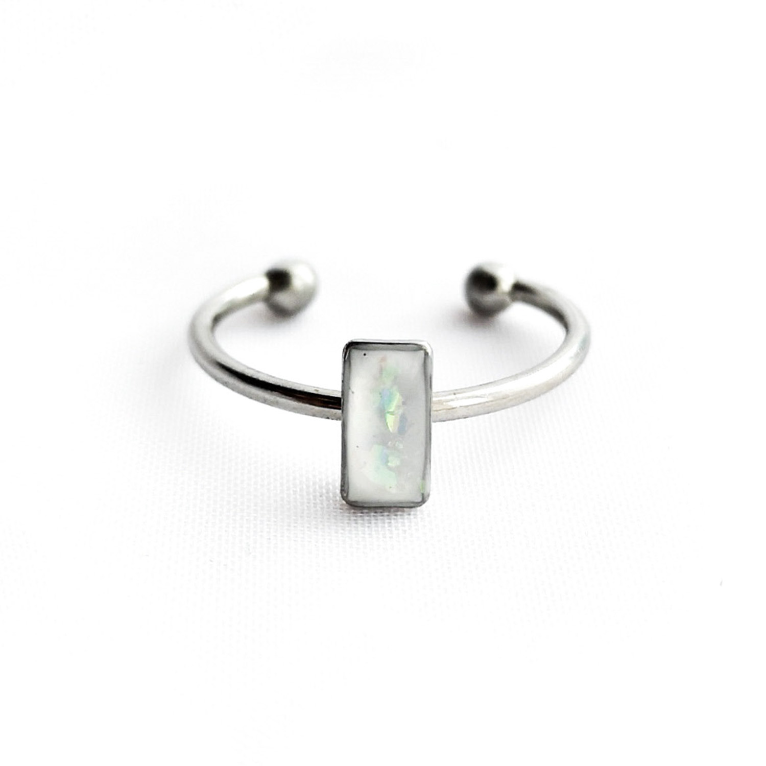 Regulowany pierścionek ze stali chirurgicznej w kształcie prostokąta, w którym zatopiono kawałki folii mieniącej się na zielono, na białym tle.